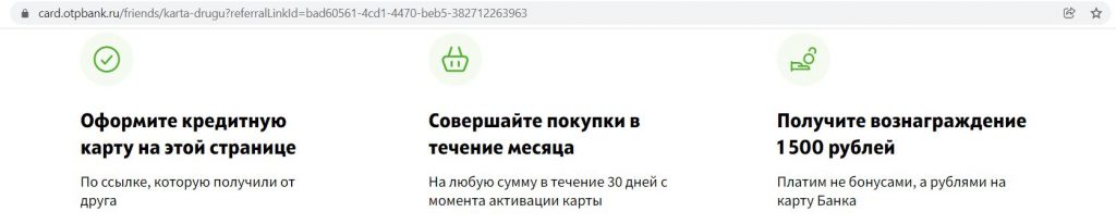 У «ОТП Банка» есть акция «Приведи друга»: если заказать карту «120 дней без %» или «Суперкэшбэк» по этой ссылке и сделать любую покупку, то банк подарит 1500 руб. Воспользоваться этой акцией можно и при оформлении карты в отделении банка (для этого нужно показать сотруднику ссылку https://r.otpbank.ru/cc/rLZ8Mg).