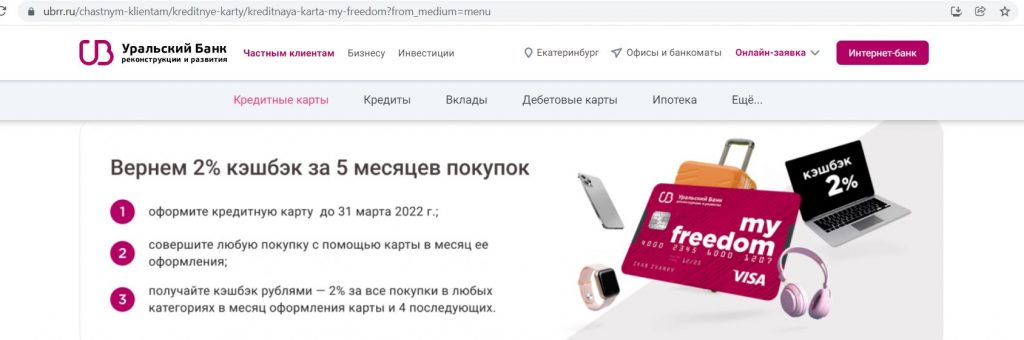 Если получить кредитную карту My Freedom в период с 17 января по 31 марта 2022 и сделать в месяц получения хотя бы одну покупку, то можно рассчитывать на кэшбэк в 2% на все покупки до конца месяца оформления и следующие за ним 4 месяца, месячный лимит кэшбэка — 2500 руб.